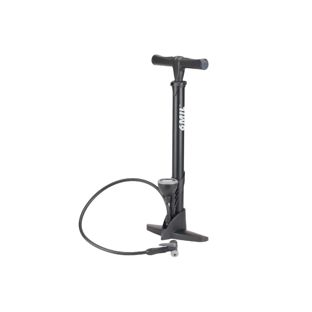 The 6MIL FP-01 is a workshop-grade floor pump with two valve interfaces and a high-pressure (130 psi) gauge.