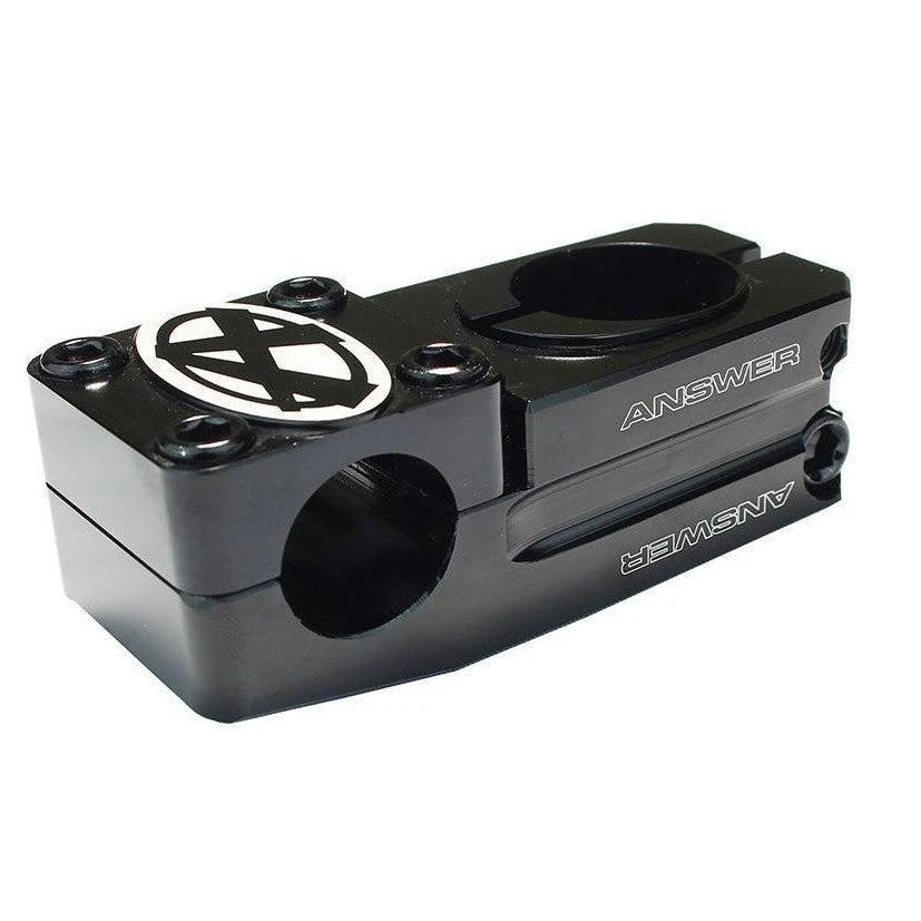 The Answer BMX Dual Length Stem features a unique adjustable length steerer tube spacer that allows for two different reach options in one lightweight package. CNC machined from 6061 aluminium with slotted sides and rear section, machined underside to further reduce weight, chamfered edges and laser-etched logos.