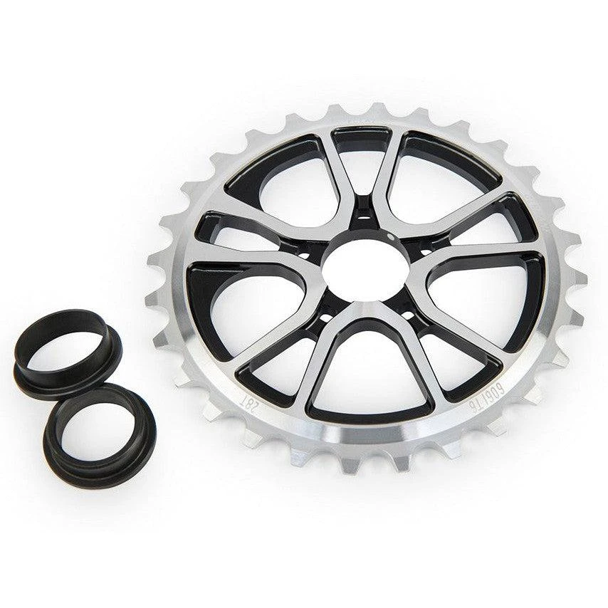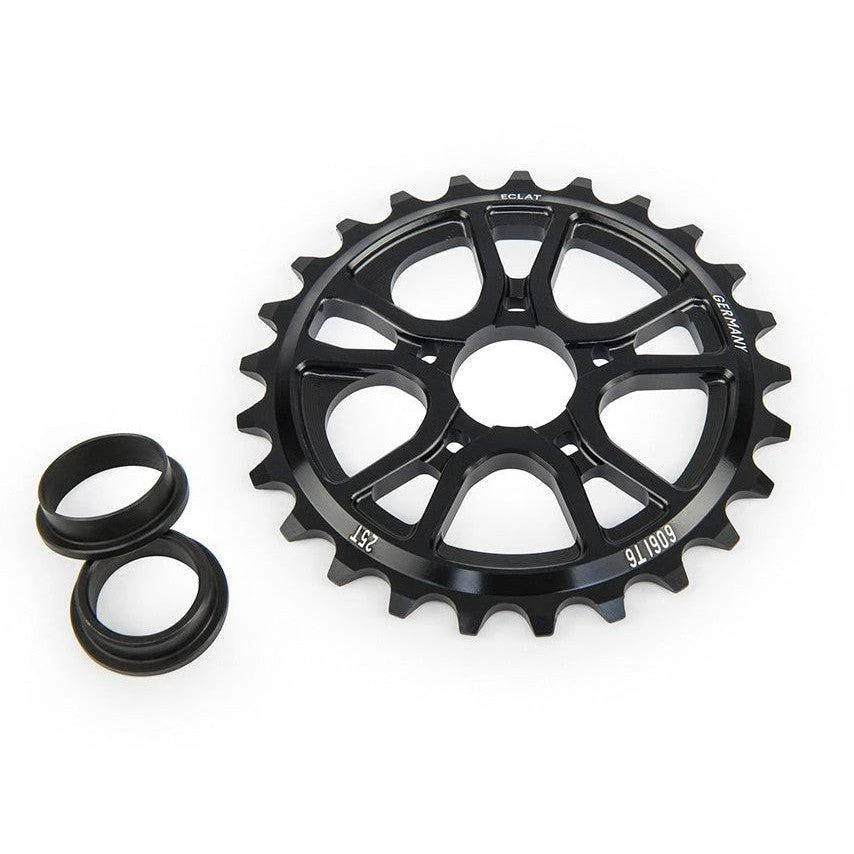 The Eclat RS sprocket uses an intricate designed based the high end wheels used on super cars. CNC machined from 6061-T6 alloy and is available in 25t, 26t and 28t. The RS is supplied with adaptors so it can be run on 24, 22 and 19mm spindles. The offset teeth on the sprocket help to maintain a perfect chain alignment on all set ups