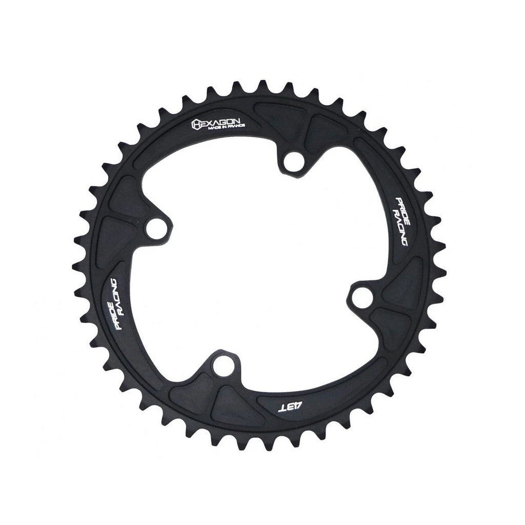 French manufactured and tested, the Pride Hexagon 4-Bolt Threaded Chainring has all the attributes that a true racer looks for in a chainring. CNC machined from solid metal, the source material for this product is high-quality 7075-T6 aluminium and features a threaded backing nut press fitted during manufacture, enabling rapid fire gearing changes. No more frustration with the spinning nut whilst you’re trying to torque up the 4 bolts evenly.
