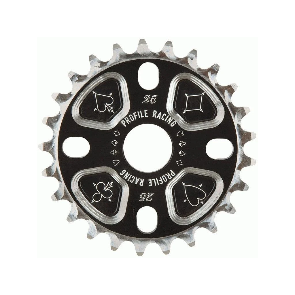 Retro radness! Profile pays homage to one of the most iconic mid-school sprockets with this updated version of the Profile Blackjack Sprocket. This sprocket has a TON of CNC machining work on it, and the end result is a piece of art! CNC machined from solid 6061 aluminum. Teeth: 1/8 Bore: 15/16 (24mm) Adapter: 19mm and 22mm Included In BLACK Available in 25t, 28t, and 30t sizes Made in the USA!