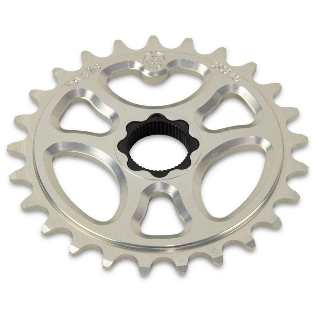 The Profile Galaxy Spline Drive sprocket is manufactured from 7075 Aluminum in the USA. This sprocket requires no sprocket bolt, instead it has a hardened CrMo steel insert in that matches up to the 48 splines in your Profile 22mm BB spindle. We have 25, 28 & 30 tooth versions available. Black only.*compatible with 22mm spline drive spindles only