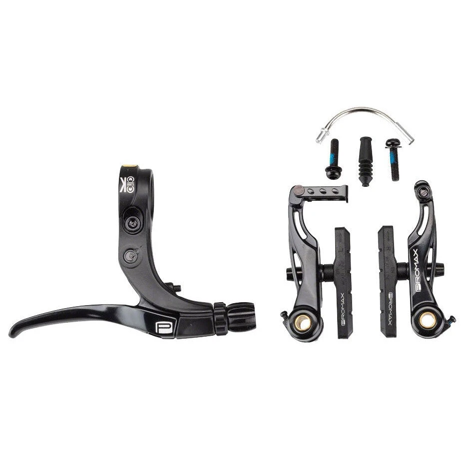 The Promax P1 Brake Kit includes one set of color-matched Promax P-1 brake arms and one Click lever, plus a standard stainless steel Promax brake cable and B-2 Air Flow brake shoes. All necessary mounting hardware also is included. Available in anodized red, blue, gold and matte black with laser-etched graphics and black hardware. Available only with one-finger short and one-finger long levers.