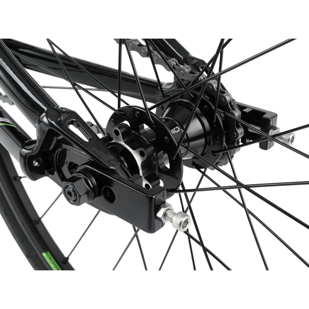 The frame is manufactured from hydro–formed 6061–T6 alloy, with forks fully built from chromoly, from the steerer tube, to the fork legs. This means that it’s a light bike, yet with tough forks, so that it can take on the biggest jumps that your sprocket rider can throw at it.