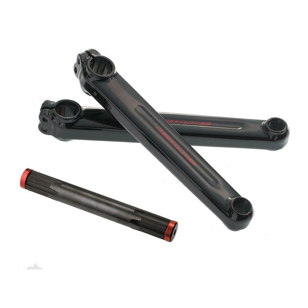 The Redline Flight Tubular Cranks are one of the most iconic cranksets in the history of BMX. 100% heat-treated tubular chromoly, dual pinch bolts, wrapped and welded at the pedal bosses. Set includes a 19mm x 6-tooth heat-treated chromoly, spindle, spindle bolts, and sprocket bolt.