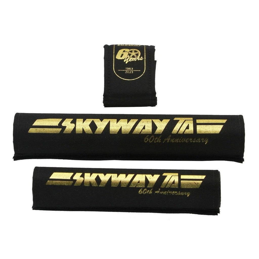 The classic 80’s era design Skyway 60th Anniversary Retro USA-Made 3 Pad Set is available right now! The Skyway 3-piece pad set comes with 3 pads – a handlebar pad, a stem pad, and the frame pad. These are newly made in the USA.
