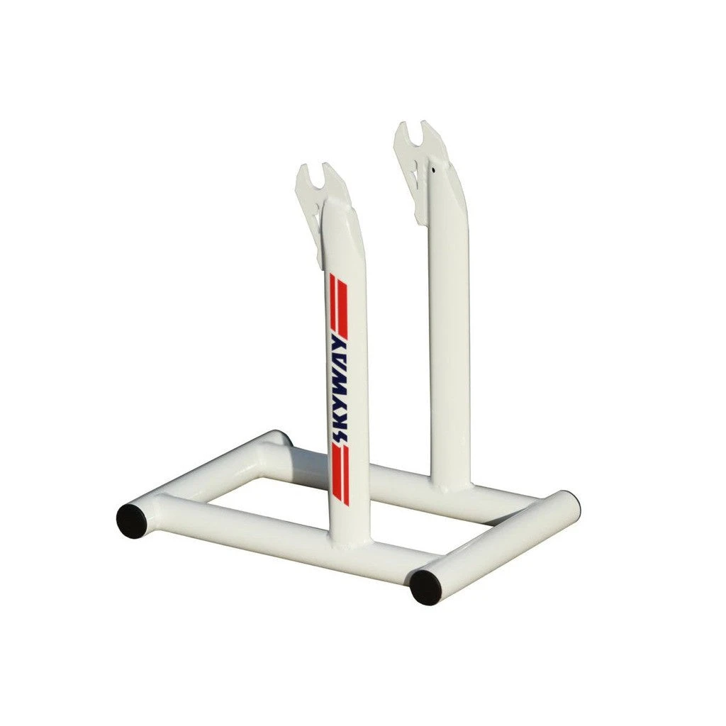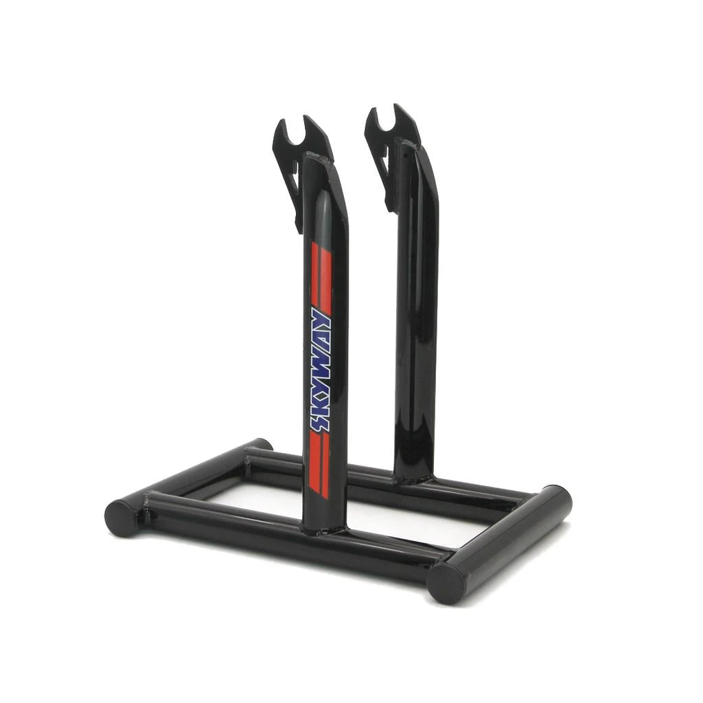 Get your retro Skyway rig standing loud and proud on these sturdy stands from Skyway! Perfect for standing your bike up at your office or home and everyone will be in awe! Skyway Stolz Stands are designed for use on the Skyway TA Replica bikes, but can be used on any BMX bike with 15mm axle nuts on the rear. Named after the designer of the original Skyway TA Frames and all other Skyway Products from that point on, the Stolz Stand is the perfect companion for that collectable TA complete in the lounge room.