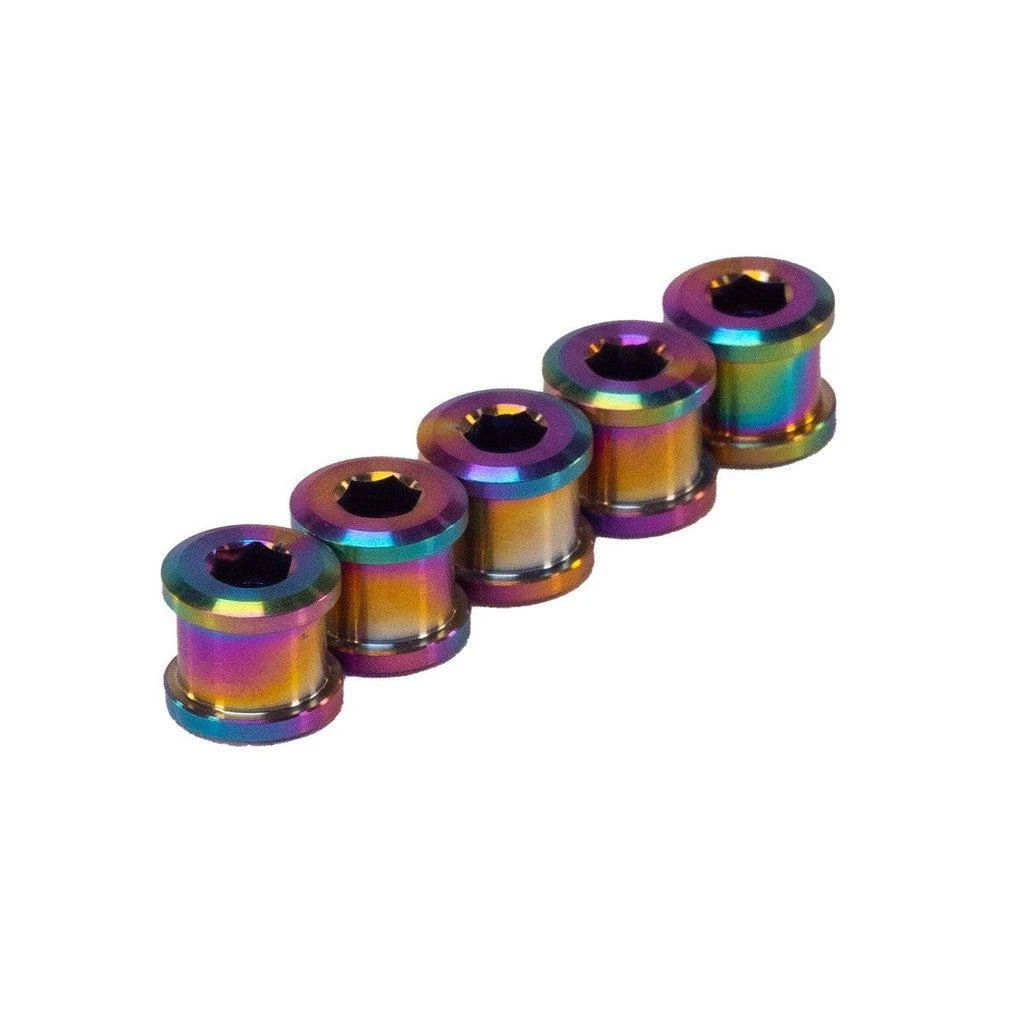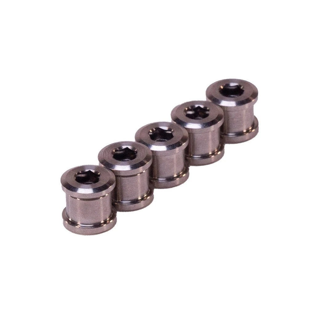 Made from high-quality Grade 5 6Al4V Titanium with a hardened nitride coating, they have the highest strength to weight ratio of any chainring bolt kit.