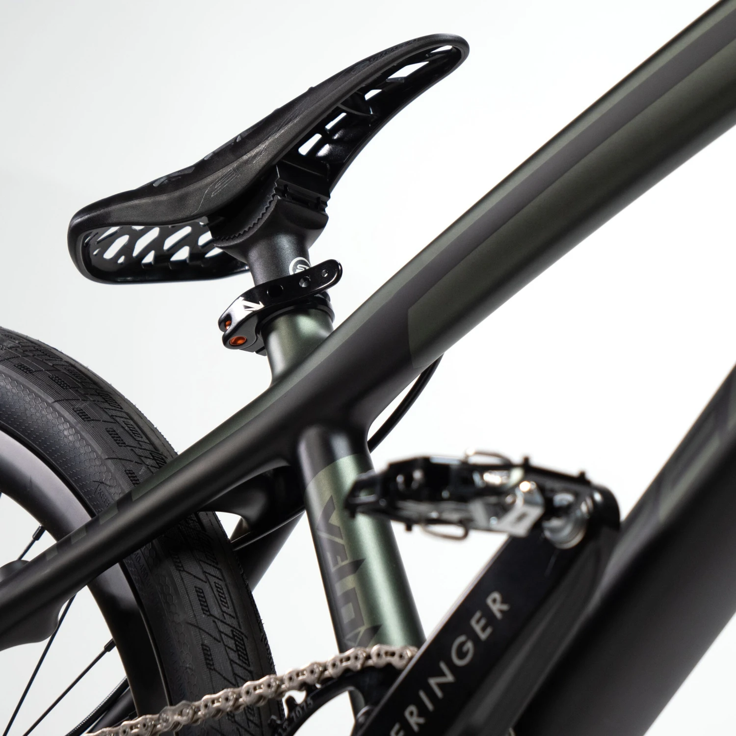 The matte green finish on this Velox frame has caught the eye of plenty on the showroom floor, and the specs will catch yours with nothing spared on this build. It mimics what customers have been building the past couple of years. On this cruiser you’ll find Onyx hubs, Avian carbon rims and 180mm Beringer cranks. Nothing but the highest quality components. HT T2 SX pedals are bolted up to the cranks and up front there’s Tangent Flatiron bars and a little nod to tradition with a Profile frontload stem.